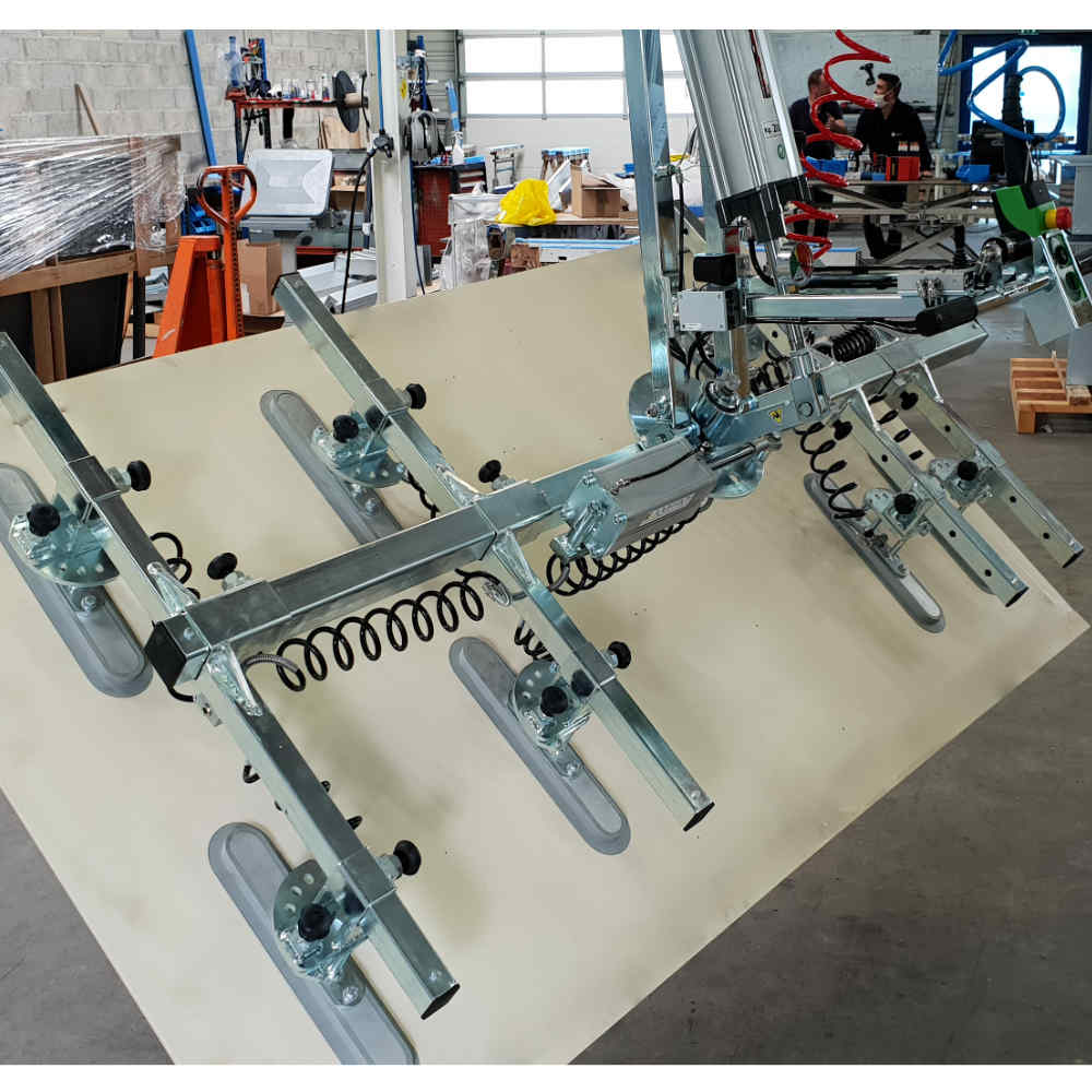 De série ces palonniers sont équipés de ventouses avec garniture en mousse pour la préhension de surfaces nervurées avec un montage sur ressorts pour faciliter la prise des panneaux en flexion.